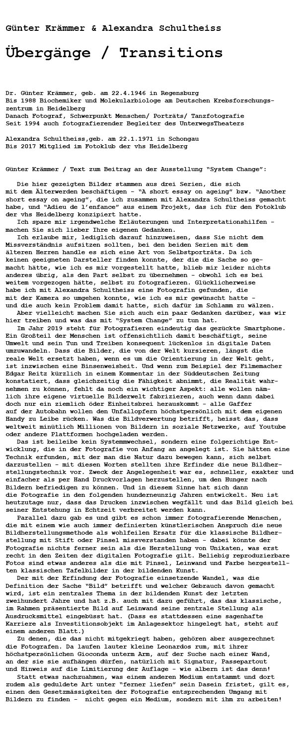 ausstellungen: übergänge / transitions (mit alexandra schultheiss) Teilnahme an der gruppenausstellung "system change" 13.9. bis 3.10. / hebelhalle des unterwegstheaters // produktion unterwegstheater